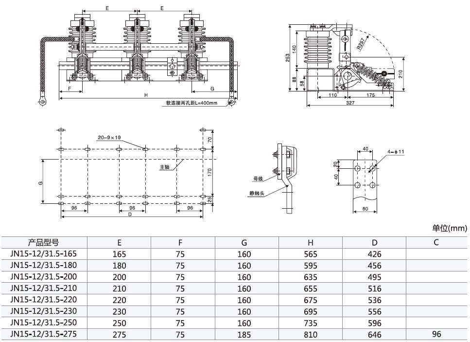 JN15-12/31.5型接地开关外形及安装尺寸